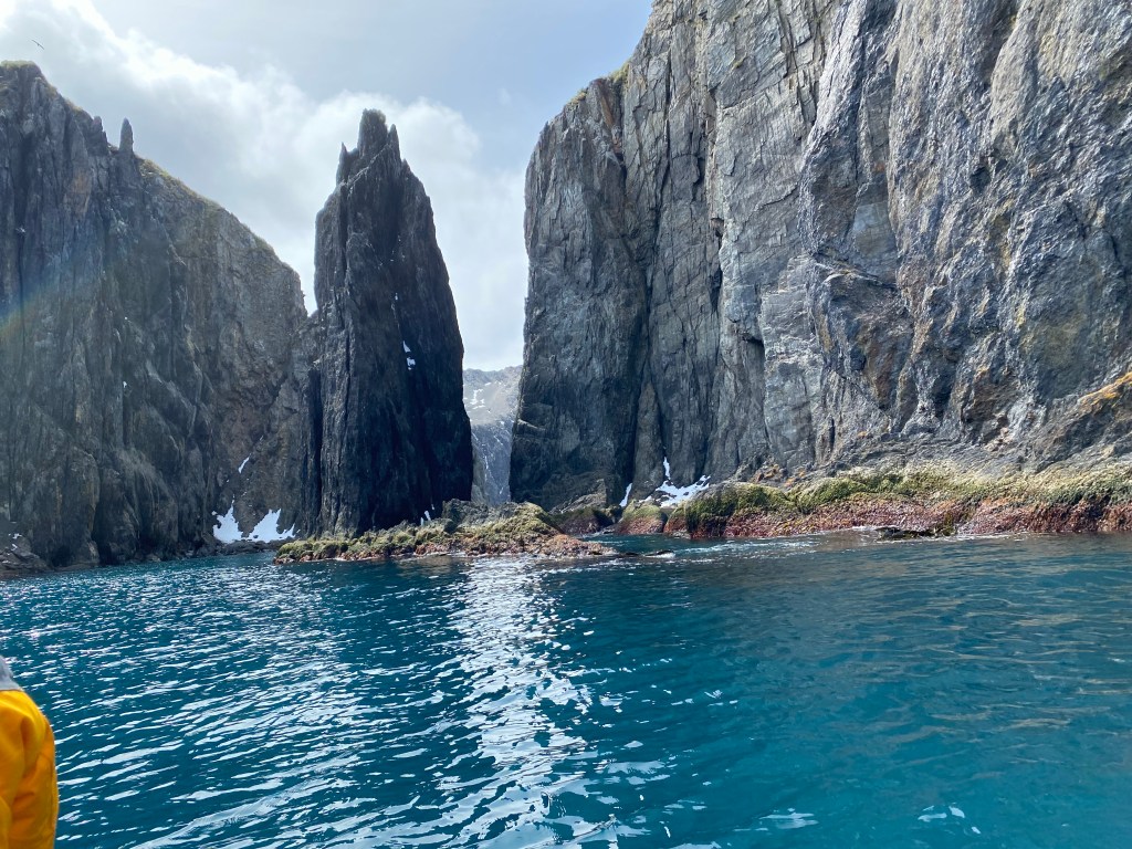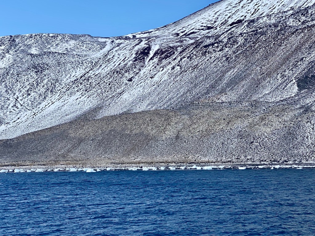 After a hazy morning with wind, snow and sleet, we arrived in the afternoon to clear skies and a way onto land. A small miracle.